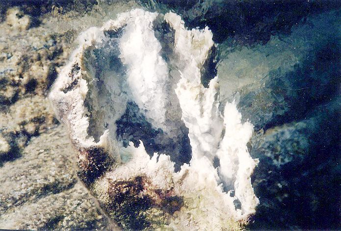 La "Cathédrale" est une cheminée en aragonite à orifices multiples formée à faible profondeur (~1 m)