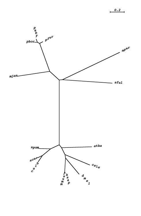 aaeo : A. aeolicum;  aful : A. fulgidus;  aper : A. pernix;  atha : A. thaliana;  calb : C. albicans;  cele : C. elegans;  csym : C. symbiosum;  ddis : D. discoideum;  dmel : D. melanogaster;  enid : E. nidulens;  gmax : G. max;  hhal : H. halobium;  hmar : H. marismortui;  hsap : H. sapiens;  lesc : L. esculentum;  lmaj : L. major;  maur : M. auratus;  mjan : M. jannashii;  mmus : M. musculus;  mthe : M. thermoautotrophicum;  mthl : M. thermoautolithotrophicum;  ncra : N. crassa;  nloc : N. locustae;  paby : P. abyssi;  parm : P. armeniaca ;  pfal : P. falciparum;  pfur : P. furiosus;  phor : P. horikoshii;  scer : S. cerevisiae;  spom : S. pombe;  ssol : S. solfataricus;  taci : T. acidophilum;  tmar : T. maritima