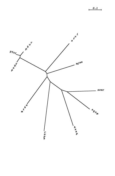 aaeo : A. aeolicum;  aful : A. fulgidus;  aper : A. pernix;  atha : A. thaliana;  calb : C. albicans;  cele : C. elegans;  csym : C. symbiosum;  ddis : D. discoideum;  dmel : D. melanogaster;  enid : E. nidulens;  gmax : G. max;  hhal : H. halobium;  hmar : H. marismortui;  hsap : H. sapiens;  lesc : L. esculentum;  lmaj : L. major;  maur : M. auratus;  mjan : M. jannashii;  mmus : M. musculus;  mthe : M. thermoautotrophicum;  mthl : M. thermoautolithotrophicum;  ncra : N. crassa;  nloc : N. locustae;  paby : P. abyssi;  parm : P. armeniaca ;  pfal : P. falciparum;  pfur : P. furiosus;  phor : P. horikoshii;  scer : S. cerevisiae;  spom : S. pombe;  ssol : S. solfataricus;  syne : Synechocystis;  taci : T. acidophilum;  tmar : T. maritima