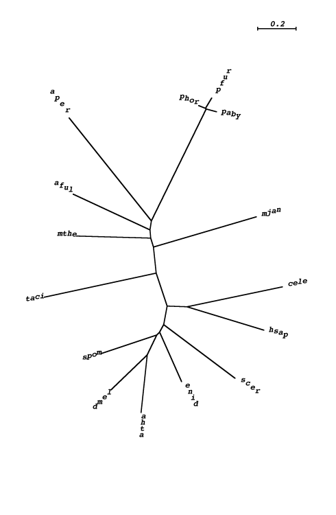 aaeo : A. aeolicum;  aful : A. fulgidus;  aper : A. pernix;  atha : A. thaliana;  calb : C. albicans;  cele : C. elegans;  csym : C. symbiosum;  ddis : D. discoideum;  dmel : D. melanogaster;  enid : E. nidulens;  gmax : G. max;  hhal : H. halobium;  hmar : H. marismortui;  hsap : H. sapiens;  lesc : L. esculentum;  lmaj : L. major;  maur : M. auratus;  mjan : M. jannashii;  mmus : M. musculus;  mthe : M. thermoautotrophicum;  mthl : M. thermoautolithotrophicum;  ncra : N. crassa;  nloc : N. locustae;  paby : P. abyssi;  parm : P. armeniaca ;  pfal : P. falciparum;  pfur : P. furiosus;  phor : P. horikoshii;  scer : S. cerevisiae;  spom : S. pombe;  ssol : S. solfataricus;  taci : T. acidophilum;  tmar : T. maritima