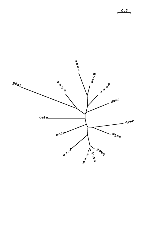 aaeo : A. aeolicum;  aful : A. fulgidus;  aper : A. pernix;  atha : A. thaliana;  calb : C. albicans;  cele : C. elegans;  csym : C. symbiosum;  ddis : D. discoideum;  dmel : D. melanogaster;  enid : E. nidulens;  gmax : G. max;  hhal : H. halobium;  hmar : H. marismortui;  hsap : H. sapiens;  lesc : L. esculentum;  lmaj : L. major;  maur : M. auratus;  mjan : M. jannashii;  mmus : M. musculus;  mthe : M. thermoautotrophicum;  mthl : M. thermoautolithotrophicum;  ncra : N. crassa;  nloc : N. locustae;  paby : P. abyssi;  parm : P. armeniaca ;  pfal : P. falciparum;  pfur : P. furiosus;  phor : P. horikoshii;  scer : S. cerevisiae;  spom : S. pombe;  ssol : S. solfataricus;  taci : T. acidophilum;  tmar : T. maritima