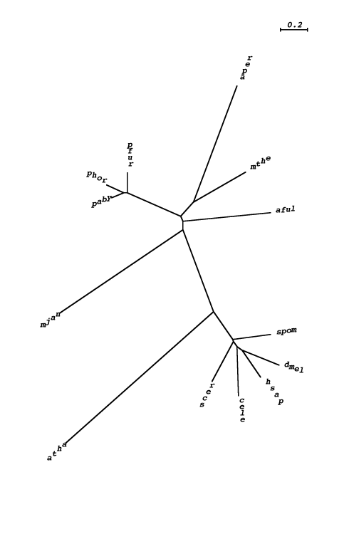aaeo : A. aeolicum;  aful : A. fulgidus;  aper : A. pernix;  atha : A. thaliana;  calb : C. albicans;  cele : C. elegans;  csym : C. symbiosum;  ddis : D. discoideum;  dmel : D. melanogaster;  enid : E. nidulens;  gmax : G. max;  hhal : H. halobium;  hmar : H. marismortui;  hsap : H. sapiens;  lesc : L. esculentum;  lmaj : L. major;  maur : M. auratus;  mjan : M. jannashii;  mmus : M. musculus;  mthe : M. thermoautotrophicum;  mthl : M. thermoautolithotrophicum;  ncra : N. crassa;  nloc : N. locustae;  paby : P. abyssi;  parm : P. armeniaca ;  pfal : P. falciparum;  pfur : P. furiosus;  phor : P. horikoshii;  scer : S. cerevisiae;  spom : S. pombe;  ssol : S. solfataricus;  taci : T. acidophilum;  tmar : T. maritima